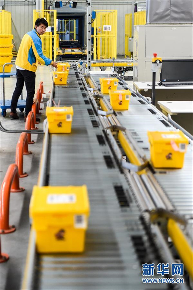 在江蘇南京蘇寧云倉物流基地,工作人員將包裝好的“共享快遞盒”放到傳送帶上,準(zhǔn)備進行分揀運輸(2017年10月31日攝)。新華社記者 李博 攝