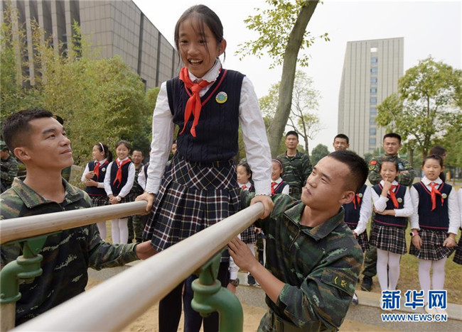 10月9日,少先隊員們在武警安徽總隊合肥支隊體驗官兵訓(xùn)練。