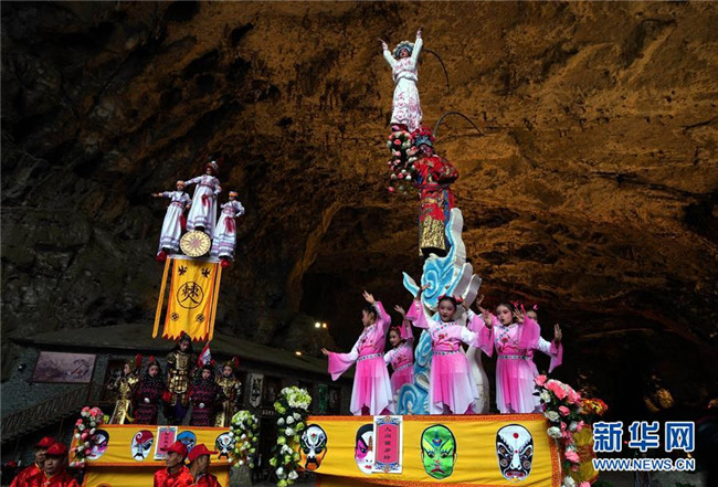 10月14日,表演者在興文石海世界地質(zhì)公園的溶洞內(nèi)表演國(guó)家級(jí)非物質(zhì)文化遺產(chǎn)“大壩高裝”。