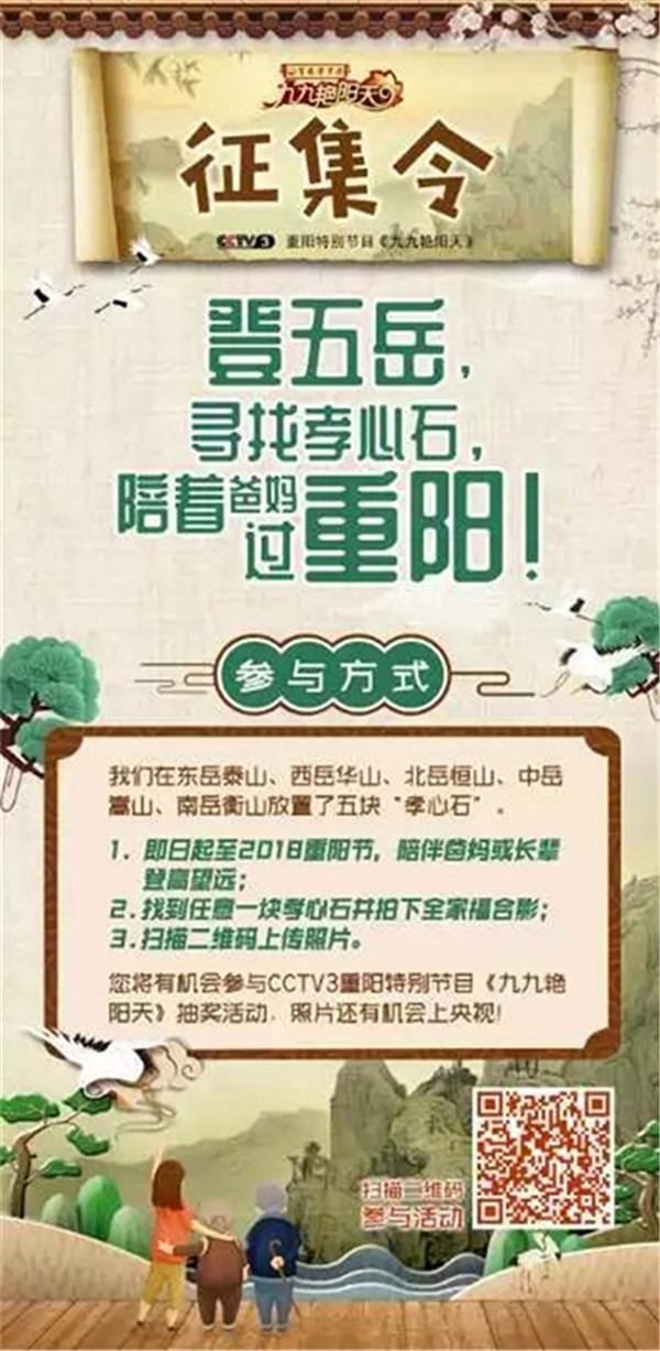 今天是2018年10月17日,農(nóng)歷九月初九重陽節(jié)。由中央廣播電視總臺央視綜藝頻道(CCTV-3)攜手中華五岳名山,共同舉辦的“登五岳  尋找孝心石  陪著爸媽過重陽”暨“福滿華夏  孝行五岳”最美笑容和祝福征集活動正在火熱進行當中,活動至10月17日重陽節(jié)。只要您陪著爸爸媽媽在五岳任意一塊“孝心石”旁拍下全家福合影,并通過掃碼填寫報名表格,上傳圖片,就可以參加CCTV-3重陽特別節(jié)目《九九艷陽天》的抽獎活動,照片還有機會上央視哦!