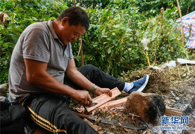 10月22日,在西藏林芝市墨脫縣墨脫鎮(zhèn)米日村臨時救災(zāi)安置點(diǎn),一名男子在制作刀鞘。 受雅魯藏布江堰塞湖影響的群眾被轉(zhuǎn)移到臨時救災(zāi)安置點(diǎn),這里秩序井然,群眾基本生活得到保障。10月17日,雅魯藏布江米林縣加拉村附近發(fā)生山體滑坡,堵塞河道,形成堰塞湖。 新華社記者 劉東君 攝