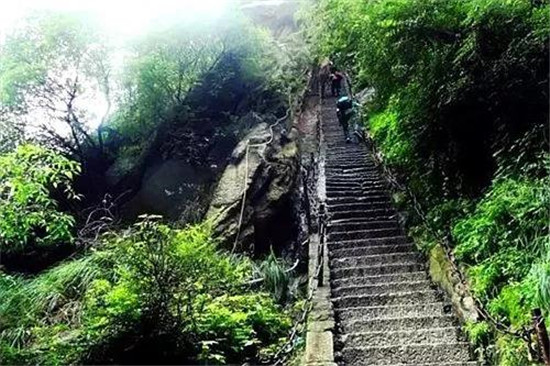 一是直上云頭。如千尺幢、上天梯、否梯、百尺峽等,開(kāi)鑿于石隙崖壁,直上直下,有聳入云天之勢(shì);二是凌空載道。一邊臨壁,一邊凌空,奇絕險(xiǎn)要。如南峰長(zhǎng)空棧道、北峰至蒼龍嶺棧道;