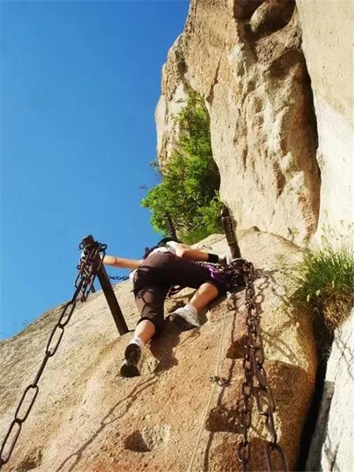 與雄壯挺立相生相伴的是險(xiǎn)要和陡峭。華山的雄偉之勢,正是由它險(xiǎn)峻的山峰特征所造就的。具體體現(xiàn)在兩個方面。一是山體拔地而起,橫空出世,山崖垂立,溝壑深邃:二是嶺脊如削,中突旁落,登山道路多沿嶺就崖而鑿,地勢險(xiǎn)要,而且古時路階僅能容足,須手腳并用才能攀登。因此,華山被稱為“奇險(xiǎn)天下第一山”也就理所當(dāng)然。清代文學(xué)家袁枚在其《登華山》詩中這樣描繪華山之險(xiǎn):“絕壁納雙踵,白云埋半腰,忽然身入井,忽然影墜巢。無路望已絕,云棧斷復(fù)交。驚魂飄落葉,定志委鐵鐐。”