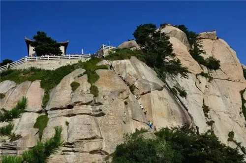 云梯,是從引鳳亭經(jīng)東石樓峰通往東峰的一段捷徑,云梯高十余米,與地面垂直呈90度角,中上部外突,呈倒坎崖之勢。梯上置懸索三條,游人挽索而攀,身體無法貼近崖壁,因而隨索擺動,心旌神搖,如同云駕霧,故名云梯。