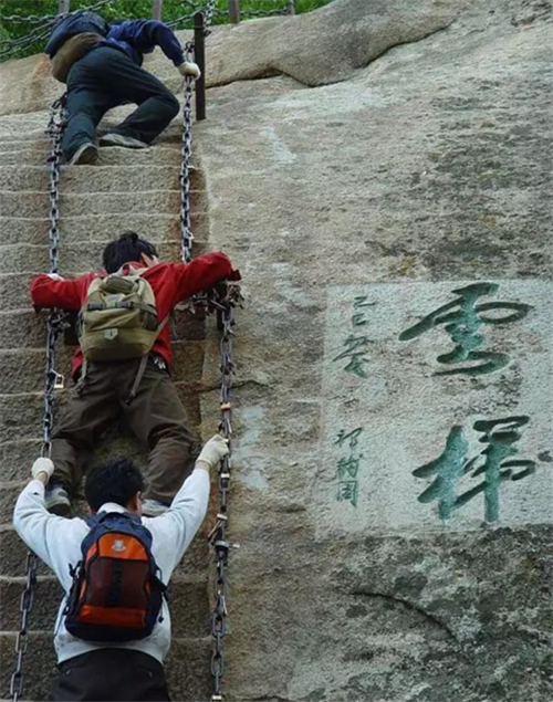 華山著名險(xiǎn)道之一“蒼龍嶺”,其位于救苦臺南、五云峰下,以其蒼黑色的外部和其似懸龍般的地勢而得名。其如履薄刃,絕壑千尺的地勢使得很多游客膽戰(zhàn)心驚,其中最著名的就是韓愈大哭投書求助的故事并引發(fā)了大量的相關(guān)典故和考證,而該處也因此留下了“韓退之投書處”的文化遺產(chǎn)。