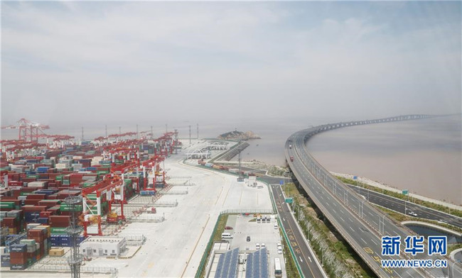 從洋山深水港四期無(wú)人碼頭控制塔上俯瞰碼頭集裝箱堆場(chǎng)(5月17日攝)。新華社記者方喆攝