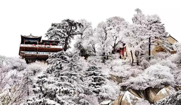 冬天的雪景——千峰筍石千株玉,萬樹松蘿萬朵銀。華山的雪景不僅是銀白的世界,而是猶如千姿百態(tài)的雪雕。雪霽,便有“林海玉樹”、“雪堆玉石”、“云中雪龍”、“巖崖雪屋”、“梨花飛揚”、“天女散花”、“紅帶玉墜”等各具形態(tài)的奇特景觀。置身在雪的境界,神清氣爽,洗心革面,冰清玉潔,忘卻凡塵。