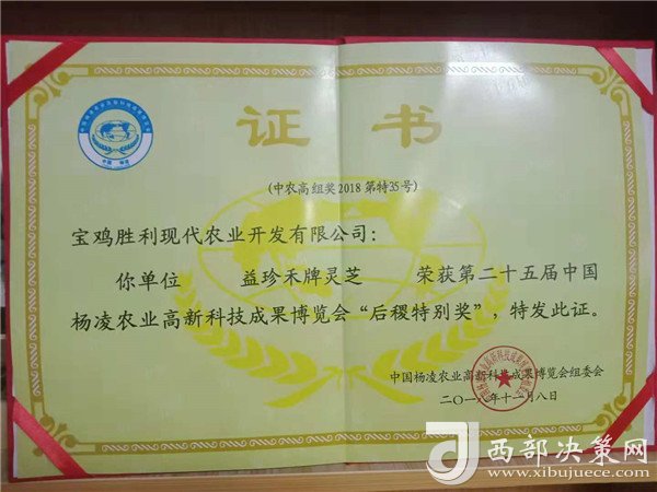 2018年寶雞勝利農(nóng)業(yè)開發(fā)有限公司生產(chǎn)的特色優(yōu)質(zhì)拳頭產(chǎn)品“益珍禾”牌靈芝參展第二十五屆農(nóng)高會,以卓越的品質(zhì)喜獲“后稷特別獎”。(供稿人:豆清海)