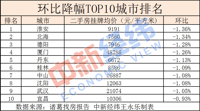 數(shù)據(jù)顯示,淮安(-1.36%)、北海(-1.34%)、德陽(yáng)(-1.28%)、廈門(mén)(-1.26%)、丹東(-1.13%)、桂林(-1.09%)、中山(-1.08%)、沈陽(yáng)(-1.08%)、武漢(-1.05%)、宜昌(-0.93%)為環(huán)比跌幅TOP10城市。