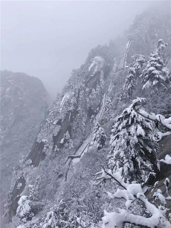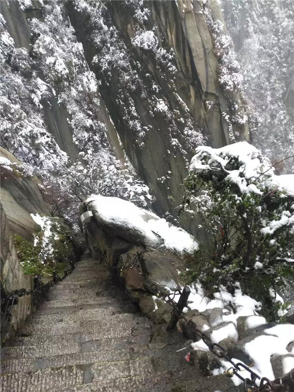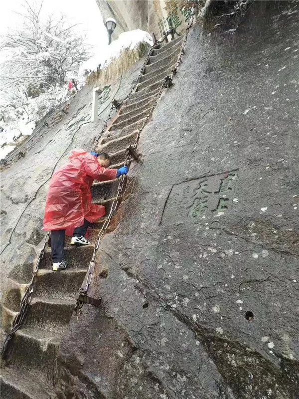 大概到了千尺幢,路就非常陡峭了,幾乎垂直攀登。戴上手套,登山杖收進背包,抓緊鐵鏈子,懸崖外寒風呼嘯,雨雪交加,絕壁上的古松巍然屹立,驢友相互鼓勵有說有笑,天冷,但心是熱的。