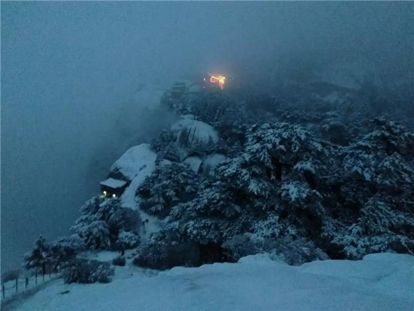 一直往上走,天色漸漸暗下來。和路上遇到的兩位山友告別后,我一個人繼續(xù)走,路面都是積雪,有的還結(jié)冰了,只好綁上冰爪,打開手電,偶爾抬頭看看被白雪浸染的山林。忽然,前面山頂上一片燈火輝煌,不知道那是不是天上的宮闕?