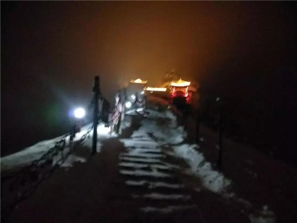 一個人,去往東峰的路注定難走,風更冷,天更黑,路更滑,我準備從南峰方向穿過去。踩著積雪“咔嚓”的響,走著走著,發(fā)現(xiàn)路面全部冰封,旁邊是懸崖,懸崖下風呼呼的刮,綁著冰爪的登山鞋在冰面試了試,不穩(wěn)定,為了安全想了想還是果斷返回。