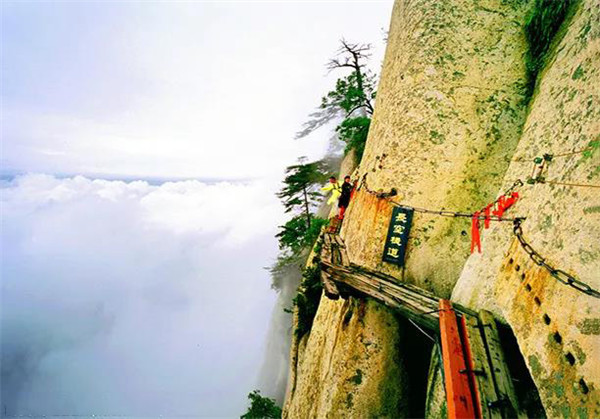 長(zhǎng)空棧道位于南天門外,是華山著名險(xiǎn)道之首。棧道分三段:南天門石坊至朝元洞西,路依崖鑿出,長(zhǎng)20米,寬二尺許,為上段。折而下,崖隙橫貫鐵棍,形如凌空懸梯,游人須挽索逐級(jí)而下,稱之“雞下架”,是為中段。再西折為下段,筑路者在峭壁上鑿出石孔,楔進(jìn)石樁,石樁之間架木椽三根,游人至此,須面壁貼腹,腳踏木椽橫向移動(dòng)前行。