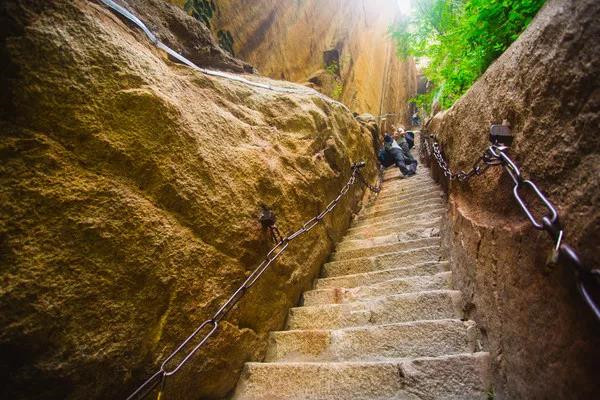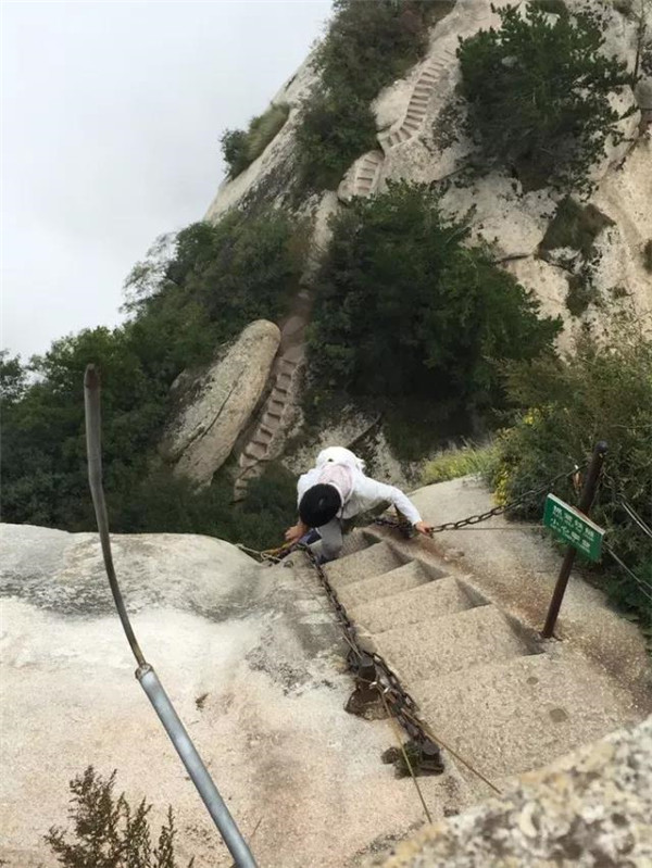 千尺幢位于回心石之上,是華山第一險(xiǎn)境。山幢壁直立,其間僅容二人上下穿行。兩邊鐵鏈垂直下垂,坡度為70°。從上到下共有370多個(gè)臺(tái)階,皆不滿足寬。