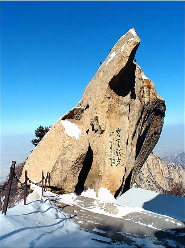 古人云:“山無(wú)石不奇,無(wú)純石不大奇”。華山之所以雄奇瑰偉,風(fēng)姿獨(dú)具,首先就在于它的主體由一塊純粹完整的巨型花崗巖構(gòu)成。遠(yuǎn)古時(shí)代的地質(zhì)造山運(yùn)動(dòng),由巖漿冷凝形成的垂直節(jié)理的花崗巖體構(gòu)成了華山奇險(xiǎn)俊秀的自然景觀。作為一塊“天然巨石”,萬(wàn)千年來(lái),華山緊緊依偎著秦嶺,成為秦嶺主脈一座特立獨(dú)行的花崗巖山。憑借大自然風(fēng)云變幻的裝扮,華山的千姿萬(wàn)態(tài)被有聲有色地勾畫(huà)出來(lái)。