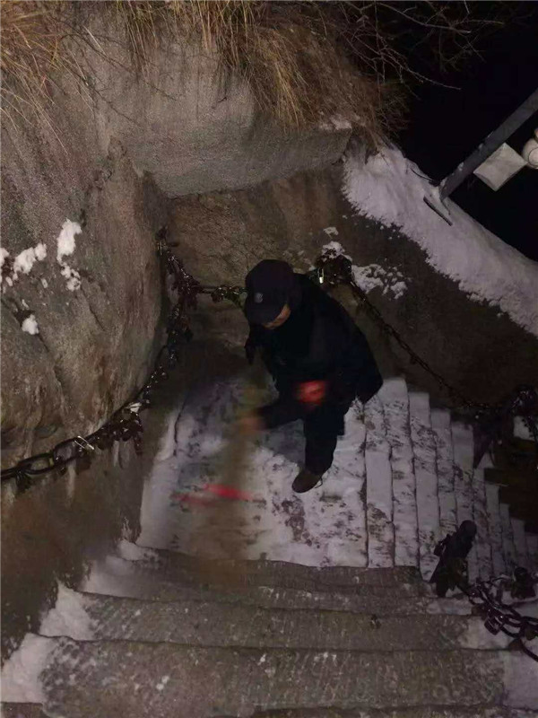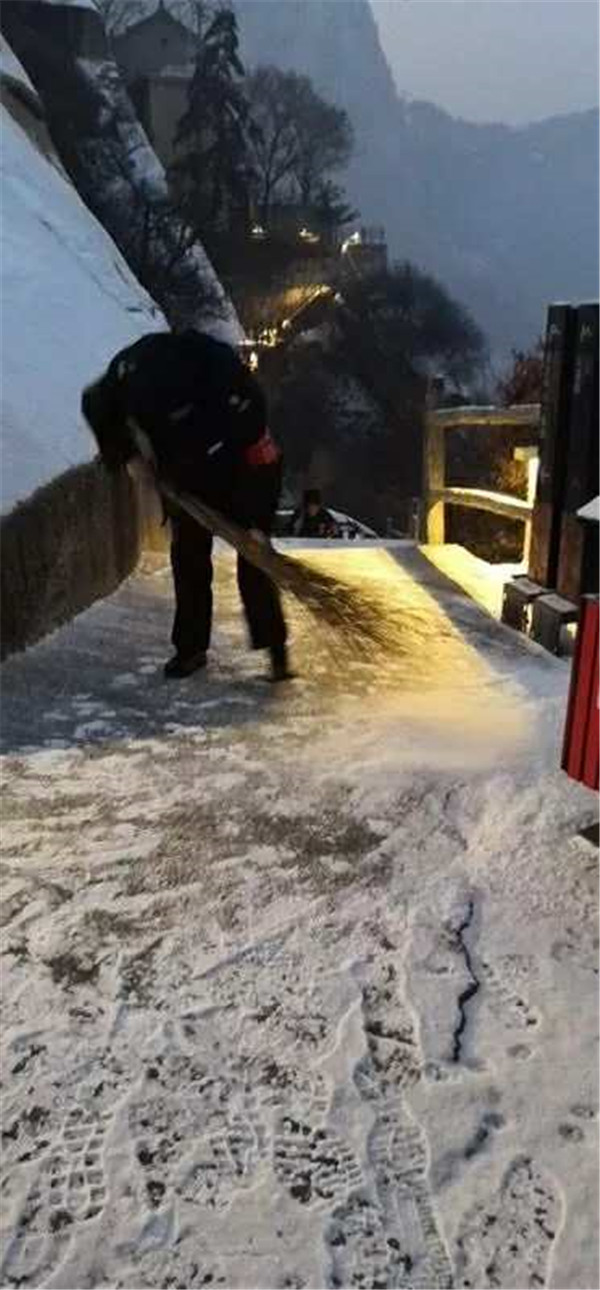 2019年元月4日,在小寒節(jié)氣到來(lái)之前,一場(chǎng)應(yīng)景的小雪降落在華山,華山主峰區(qū)的工作人員第一時(shí)間清掃積雪,為游客的安全保駕護(hù)航。