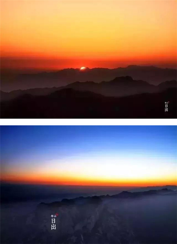 是時,但見夜幕自東方悄然隱退,晨曦初露,漸漸霞光瑰麗,云源奔涌。瞬間,一輪火球噴薄而出,繼而光芒四射,氣象萬千,整個世界大放光明,游人身心為之一振。待云霧散盡,蒼松翠柏,則更加清麗悅目,美妙神奇。故而,游名山者必登華山,登華山者必觀日。華山日出亦被列為華山自然風(fēng)光中的重要景觀之一。