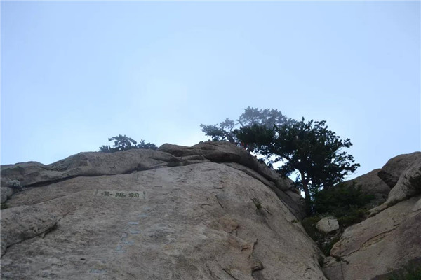 我和孩子抓緊時間往東峰趕,經(jīng)紫氣臺、二仙坎,攀爬一道石梁前往東峰山門。此時飄來小雨點(diǎn),我們顧不得腳下濕滑加快了腳步。經(jīng)鷂子翻身,孩子想要征服天險的念頭依然強(qiáng)烈,一心想翻鷂子翻身,后因人多需排隊等候而暫時放棄。東峰又叫朝陽峰,朝陽臺是觀日出的勝地。我倆左轉(zhuǎn)攀爬朝陽臺,雨漸漸大起來。至臺頂,方舉目四顧,黃豆大小的密集雨點(diǎn)劈頭蓋臉砸下。朝陽臺上沒有看到太陽,卻遭遇暴雨,我們狼狽撤離朝陽臺。