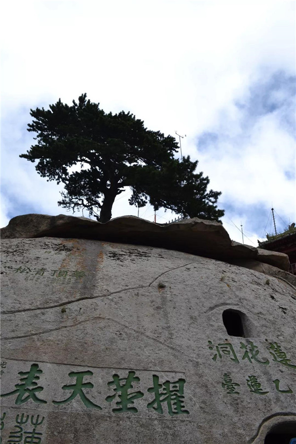 小心謹(jǐn)慎通過青龍背,迎面一方碩大石體,石壁滿布?xì)v代石刻,頂端平坦,狀如蓮花,也許這就是西峰又名蓮花峰的由來吧!行不遠(yuǎn),有巨石懸于頭側(cè),原來這就是大名鼎鼎的斧劈石!孩子聽著我講沉血“劈山救母”的美麗傳說,對沉香手中的神斧產(chǎn)生了濃厚的興趣。那巨大的石頭,被神斧劈開,斷面整齊利落,就那么懸在山頂,好像一陣風(fēng)就能吹落。我拉著孩子快步通過斧劈石,總感覺巨石會從天而降!