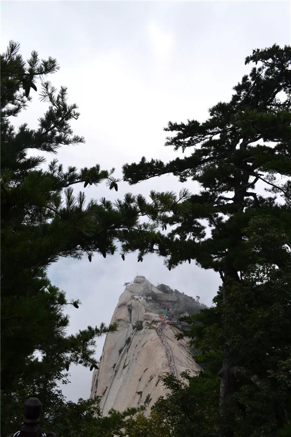 經(jīng)煉丹爐、孝子峰,云霧悄悄退隱,我們向南峰頂挺進(jìn)。南峰蒼翠秀麗,沿途的華山松千姿百態(tài),引人注目。華山迎客松生長于懸崖峭壁的石縫中,向懸崖一側(cè)伸出虬勁的枝干,就像好客的秦人伸出有力的大手歡迎遠(yuǎn)道而來的客人。虬枝龍形的枝干上,是綠意盎然的松針,根根好像要刺破天穹。華山迎客松在藍(lán)天白云的映襯下,仿如碧玉雕琢而成,綠的耀眼,秀挺卓然!