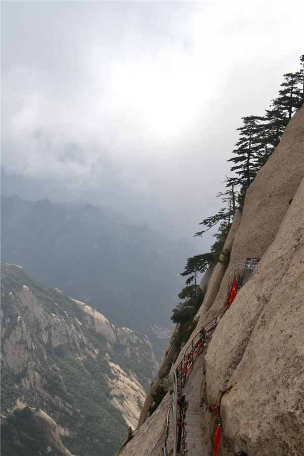 面向西峰方向,左側(cè)是斧劈般的絕壁,右側(cè)是坡度陡峭的山嶺。山脊兩側(cè)豎有結(jié)實(shí)的鐵柱,以腕粗的鐵鏈相連續(xù)。膽小的人屏住呼吸,緊抓鐵鏈前行;膽大的年輕人,不抓鐵鏈,走在中間,總讓人擔(dān)心他會滑跌!腳下的山脊有一定坡度,并不能踩平實(shí),就像走在傾斜的平衡木上。緊窄處,上山下山的人需錯身通行。華山之險,讓我們刻骨銘心!