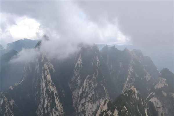 由西峰返回去往南峰,在青龍背上,斷崖側(cè)的云霧漸漸升騰上來,遠(yuǎn)處的山峰松柏,隱入云霧中。升騰上來的霧氣,彌漫到了眼前,眼睛、面龐也被霧氣濕潤了。斷崖外的一切景致,已完全不見了蹤影,白霧茫茫,仙風(fēng)陣陣,人猶如騰云駕霧一般。孩子伸手去抓云霧,可云霧哪里是能抓到的。我們何其有幸?竟然不期而遇“云霧華山”的奇景!