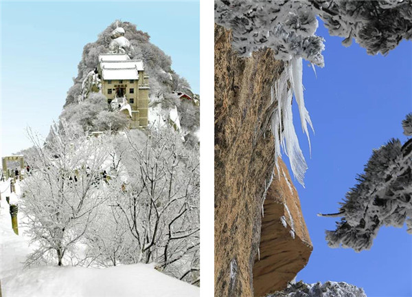 華山在11月進(jìn)入冬季,12月至次年3月全山飄雪,而2月前為最旺雪期。游客可欣賞到難得一見(jiàn)的華山雪景——美麗的霧凇給樹(shù)木、巖石、屋舍都披上一層晶瑩的薄衣,尤其在大雪覆蓋后,山景變成一幅曼妙的白色圖畫,峰上的樹(shù)木和古藤被透明的冰層包裹,極富魅力。