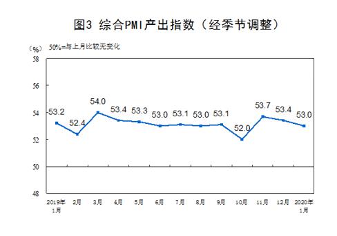 2020年1月份,綜合PMI產(chǎn)出指數(shù)為53.0%,比上月回落0.4個百分點,位于臨界點之上,表明我國企業(yè)生產(chǎn)經(jīng)營活動總體擴張有所放緩。 (楊曦)