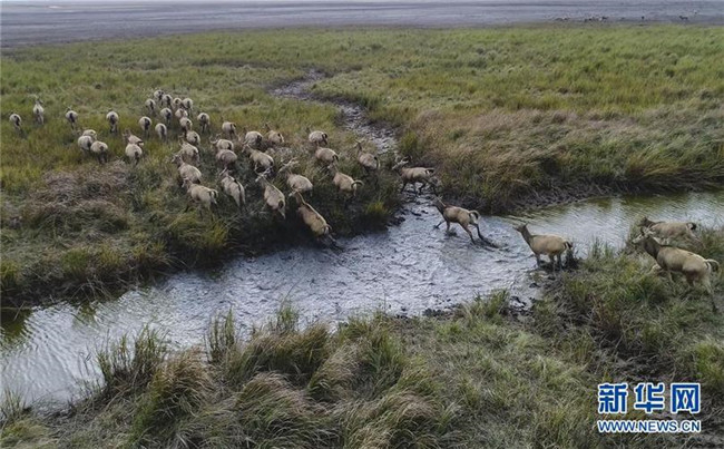 這是2017年11月14日在江蘇大豐麋鹿國(guó)家級(jí)自然保護(hù)區(qū)拍攝的麋鹿(無(wú)人機(jī)拍攝)。新華社記者 季春鵬 攝