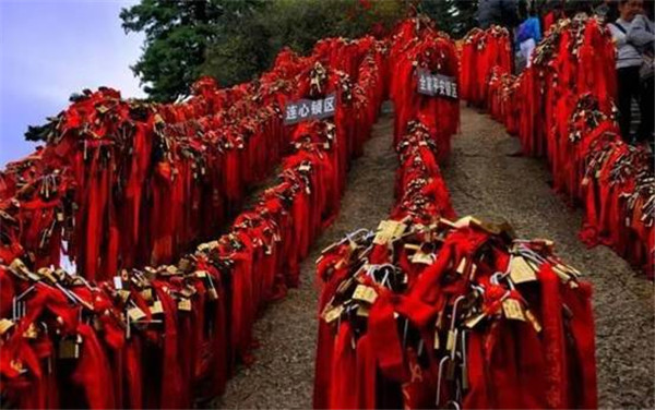 金鎖關(guān)——登山路兩側(cè)鐵索上情侶鎖,重重疊疊,紅繩彩線迎風(fēng)搖曳,在這里,鎖住你們對(duì)愛(ài)情的誓言,表達(dá)隊(duì)愛(ài)情忠貞!