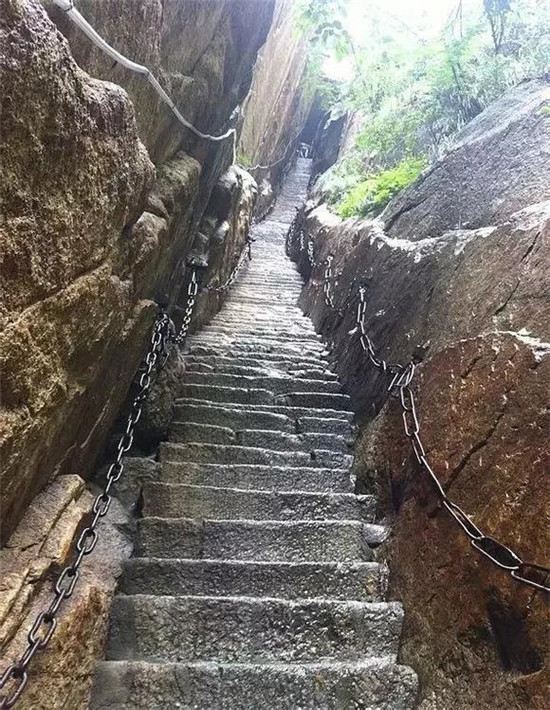 在北峰的一座道觀休息一會后,我們沿著配有鐵鏈的危險道路向南峰發(fā)起了挑戰(zhàn),當(dāng)攀登擦耳崖時真有些恐懼,這是華山的險道之一,臺階寬不過30厘米,下臨深谷真讓人有些躊躇不前。爬過了上天梯,日月崖,我們到了著名的蒼龍嶺,在那里我和我的中國朋友決定停止向上攀爬,“我們看的夠多了”,于是我們開始下山,帶著征服的滿足感,此刻我明白了“道”的第三個哲理:知道什么時候停止的人不會陷入困境。(道德經(jīng),第44節(jié))
