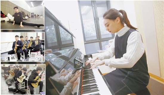 在浙音??嫉娜兆?,能很容易分辨出這些不同專業(yè)的學生。背著大包小包各種形狀樂器的,通常是器樂演奏專業(yè)的考生;舞蹈專業(yè)的女生大多梳著丸子頭,就算穿著臃腫的羽絨服,還是老遠就能看到她們筆挺的腰,給她們服務(wù)的師兄師姐,也是整個校園里顏值最高的群體。