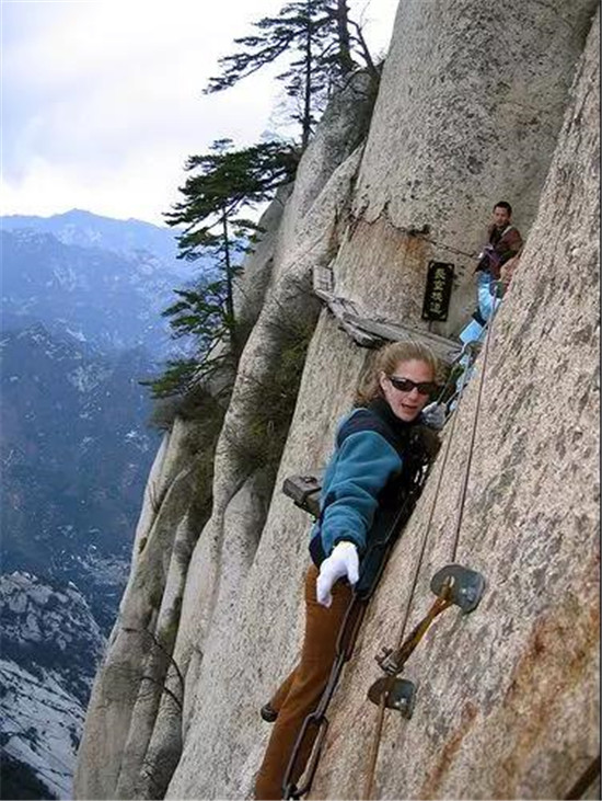 華山道路最危險(xiǎn)的地方當(dāng)屬“長(zhǎng)空棧道”,13英尺長(zhǎng),1英尺寬的木板就修在垂直的懸崖之上。在那里的一個(gè)失足就會(huì)使你墜入下面的萬(wàn)丈深淵。棧道上有安全帶加以保護(hù),如果你想冒險(xiǎn)嘗試,綁上安全帶并把你系在繩索上,在一些地段,僅有一條安全帶和一些鑿在石頭里的腳窩作為支撐。