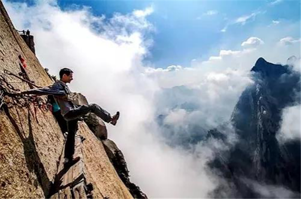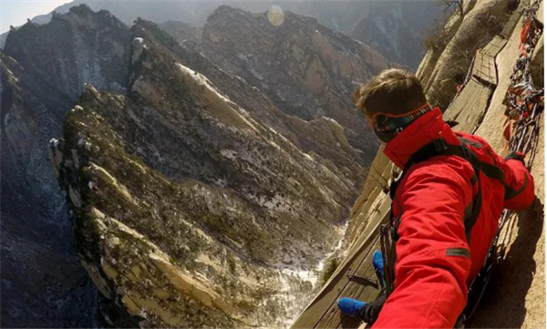 我獨(dú)自一人出發(fā),一段垂直的石隙,鐵條插在巖石之中,道路向下延伸,風(fēng)刮得很大,我雙手麻木,死死地抓住鐵鏈,慢慢向下挪動(dòng),腳下是一千米深的峽谷,這是一個(gè)恐懼與光榮交織的時(shí)刻。我走在棧道上,左右上下地欣賞著風(fēng)景,周?chē)笊骄薮蠖陋?dú),我感覺(jué)自己就像是一個(gè)塵埃,真的太渺小了。冰屑落到頭頂上,幸虧不是石塊。我聽(tīng)到一群中國(guó)游客笑著從石隙中下來(lái),我停下來(lái)照了幾張相,要回去必須原路返回,這同樣不容易,我很感謝地歸還了手套,繼續(xù)向其他山峰攀登。由于有安全保護(hù)措施,因此我不認(rèn)為華山是“世界上最危險(xiǎn)的道路”。