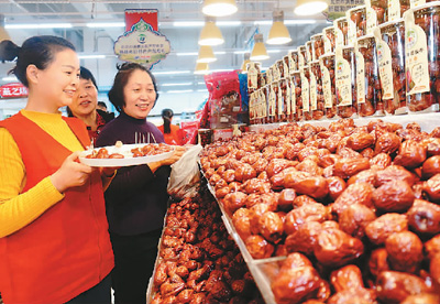 3月18日,北京市商務局等部門聯(lián)合舉行“北京市消費扶貧產(chǎn)品專區(qū)”暨“和田地區(qū)特色產(chǎn)品專柜”啟動儀式,通過深入開展消費扶貧,著力拓寬受援地區(qū)農(nóng)產(chǎn)品銷售渠道,帶動貧困人口增收脫貧。預計年內(nèi)開設扶貧產(chǎn)品專柜的門店將達到100家。圖為消費者在北京石景山區(qū)一家超市“扶貧產(chǎn)品專區(qū)”選購和田大棗。本報記者 賀勇攝
