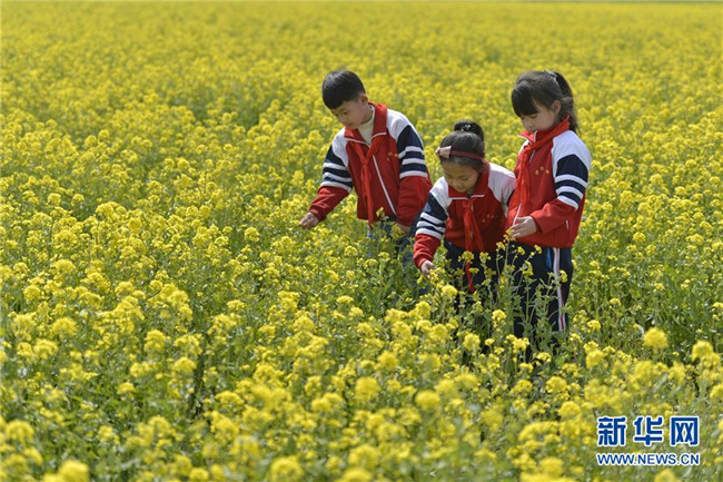 3月26日,幾名小學生在河北省沙河市東葛泉村油菜花田內(nèi)玩耍。