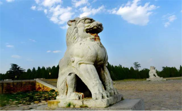 在橋陵的石雕中,特別值得一提的是橋陵的一對(duì)石獅子,歷經(jīng)千年的風(fēng)雨侵蝕,可威風(fēng)依然不減當(dāng)年,四肢健壯、昂首挺胸、怒目圓睜,顯示出“天地之間,唯我獨(dú)尊”的傲氣、霸氣,它造型優(yōu)美,氣勢(shì)磅礴,體現(xiàn)出唐代粗礦、奔放的時(shí)代氣息,而最讓人叫絕的是它的尾巴,從腿底鉆進(jìn)又掏出來(lái)卷曲于背部,動(dòng)物的調(diào)皮可愛(ài)活靈活現(xiàn)展現(xiàn)在我們眼前。它是石刻中的精品,石刻的精美,氣魄的宏大,堪稱“東方第一獅”。像這樣的獅子四個(gè)門(mén)前都有,保存的特別完好,東門(mén)的回頭望,西門(mén)的卷舌獅在唐代帝王陵中都是絕無(wú)僅有的。