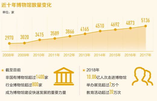 據(jù)文化和旅游部統(tǒng)計(jì),2008年至今,我國博物館的數(shù)量呈現(xiàn)明顯加速增長之勢。截至2017年底,全國在各級政府備案的博物館達(dá)到了5136家,每年新增博物館平均在180家左右。