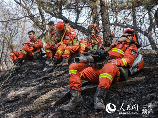 火場火勢緩解后,消防員原地休息。(甘肅省森林消防總隊供圖)