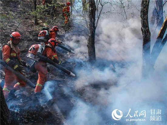 消防員到達火場后開始打火。(甘肅省森林消防總隊供圖)