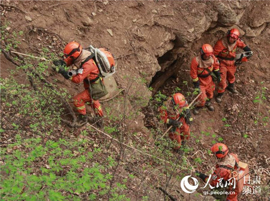 消防指戰(zhàn)員現(xiàn)場開辟臨時通道,采用繩索攀登的方式組織上山。(甘肅省森林消防總隊供圖)