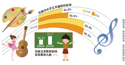 根據(jù)教育部公布的最新數(shù)據(jù),2018年全國(guó)小學(xué)藝術(shù)器材達(dá)標(biāo)率提高到93.8%,初中提高到95.5%;2018年全國(guó)義務(wù)教育階段美育教師人數(shù)增加到71.7萬(wàn)人。比10年前有較大幅度提高。