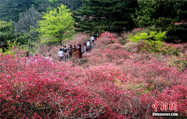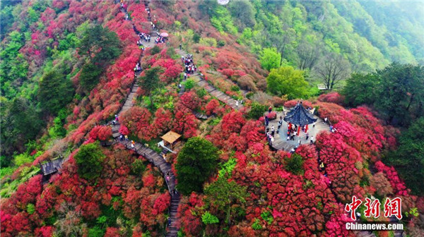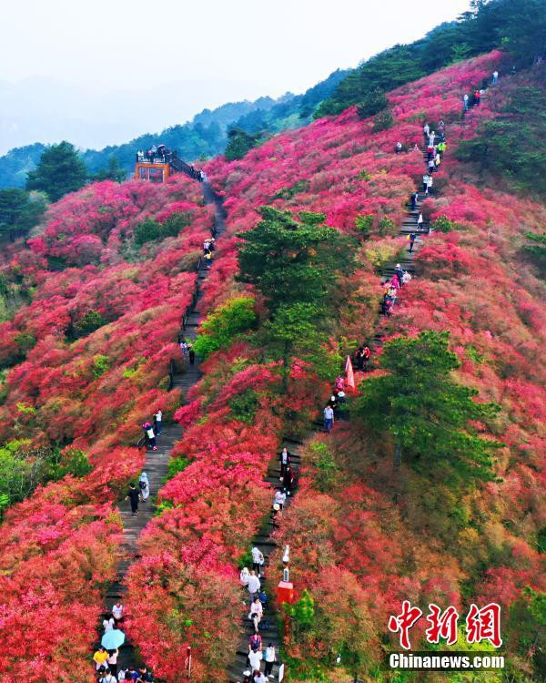 4月20日,游客在龜峰山的杜鵑花海游玩。近日,湖北省麻城市龜峰山的古杜鵑花盛開,大量游客前來(lái)賞花觀景。中新社記者 汪立敏 攝