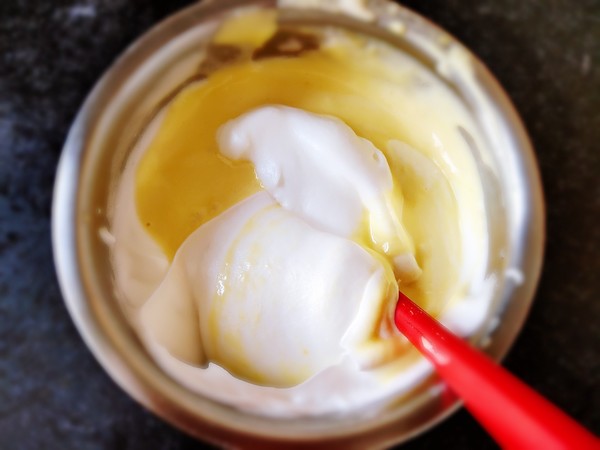 4.上下翻拌成面糊,把蛋黃加進(jìn)去了
