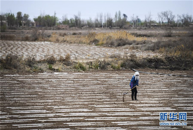 在新疆生產(chǎn)建設(shè)兵團(tuán)第六師共青團(tuán)農(nóng)場的棉花地中,一名農(nóng)場職工在無人駕駛精量播種機(jī)播種之后的棉田上,檢查地膜表面壓土情況(4月22日攝)。
