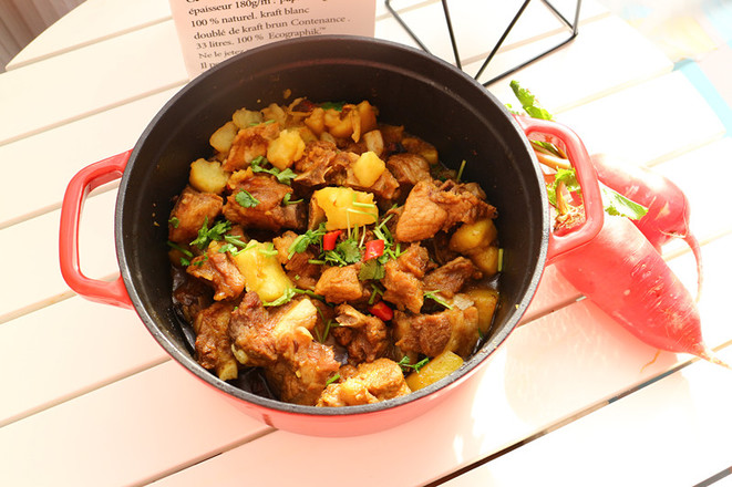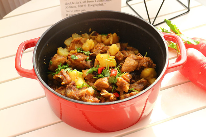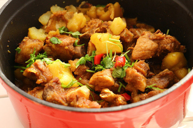 10.撒上少許的辣椒,香菜點綴提味,香噴噴的排骨土豆就做好了,雖然是家常菜,但是做出來一樣特別的好吃。