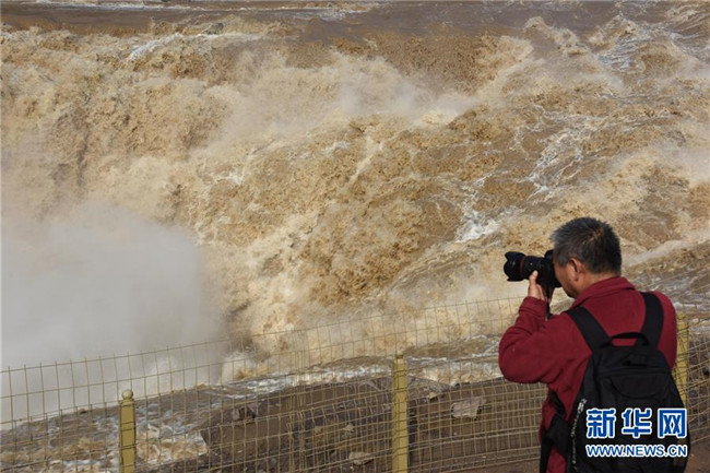 4月29日,游客在山西省臨汾市吉縣黃河壺口瀑布景區(qū)拍照。 近日,受上游降雨和水庫(kù)調(diào)節(jié)放水影響,晉陜交界的黃河壺口瀑布再現(xiàn)壯美瀑布群景觀。 新華社發(fā)(呂桂明攝)