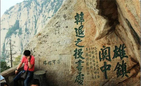 一座山就是一塊花崗巖巨石,自古華山一條道,唐時韓愈游華山,雄心勃勃,攀至蒼龍嶺時,向下望了一眼,頓時覺得頭暈?zāi)垦?,兩腿打?zhàn),兩腋生風,再也不敢挪動一步,趺坐于山脊一凹處,上不去,下不來,走投無路。絕望之下,將衣衫撕成片,寫下求救信,扔下山崖,終有一條被人揀到,報與官府,這才得救?,F(xiàn)有蒼龍嶺“韓愈投書處”為證。