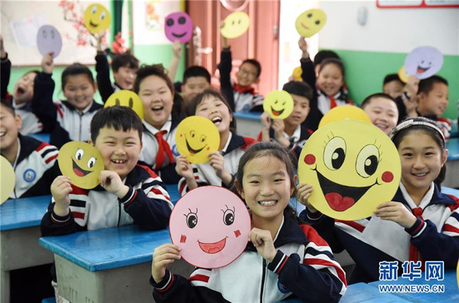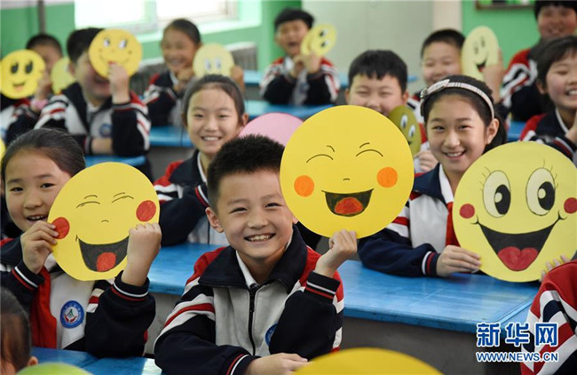 5月7日,河北省邯鄲市光明南小學(xué)的學(xué)生在展示笑臉卡。新華社發(fā)(郝群英 攝)