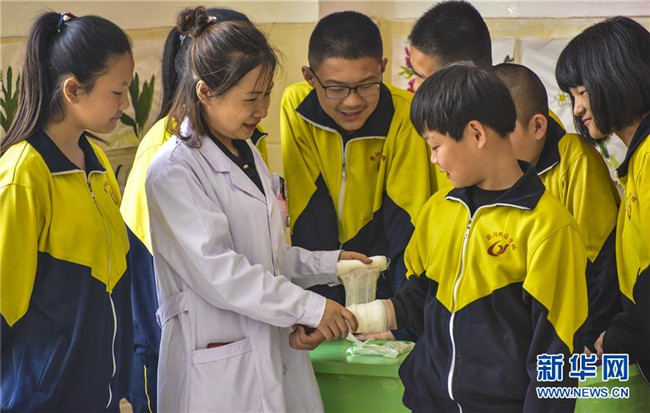 5月8日,在衡水市景縣黎陽(yáng)學(xué)校,景縣中醫(yī)院醫(yī)護(hù)人員為學(xué)生演示傷口包扎急救。新華社記者 李曉果 攝
